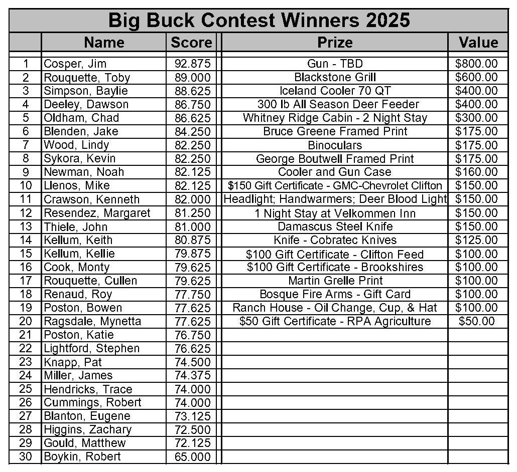 Every year, Clifton Feed and Clifton Chamber of Commerce hosts its annual Big Buck Contest. The competition features an assortment of wonderful prizes listed below. Thanks so much to each sponsor who makes this contest a success!